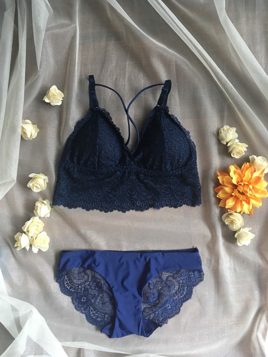 ネイビーブルーのショーツはヒップ部分が総レースのシームレスタイプ、デザインも素敵ですが、お洋服に響かないのでデイリーに使えるお品 ○sizeフリー(バストA〜E.アンダー65〜75.ショーツMsize)